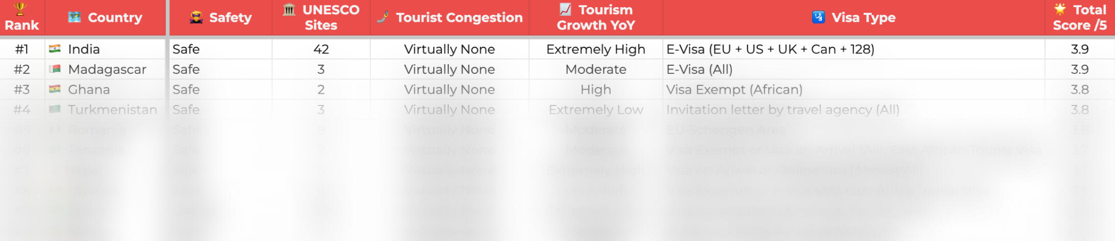 I'm a traveler who has gone to lesser traveled locations for 10+ years. I leverage insights from UN, WHO, IMF and World Bank to uncover hidden gem countries by analyzing key metrics like tourist congestion and safety so you can pick your next travel destination with confidence, rather than winging it which is how I've done it before.
